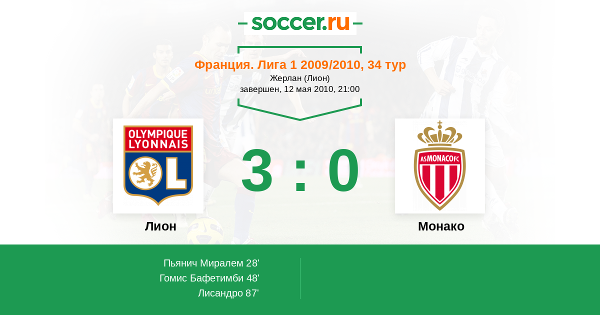 Франция. Лига 1 29.05.2011 Монако Логотип футбольный клуб Монако 0:2 Логотип футбольный клуб Лион Лион