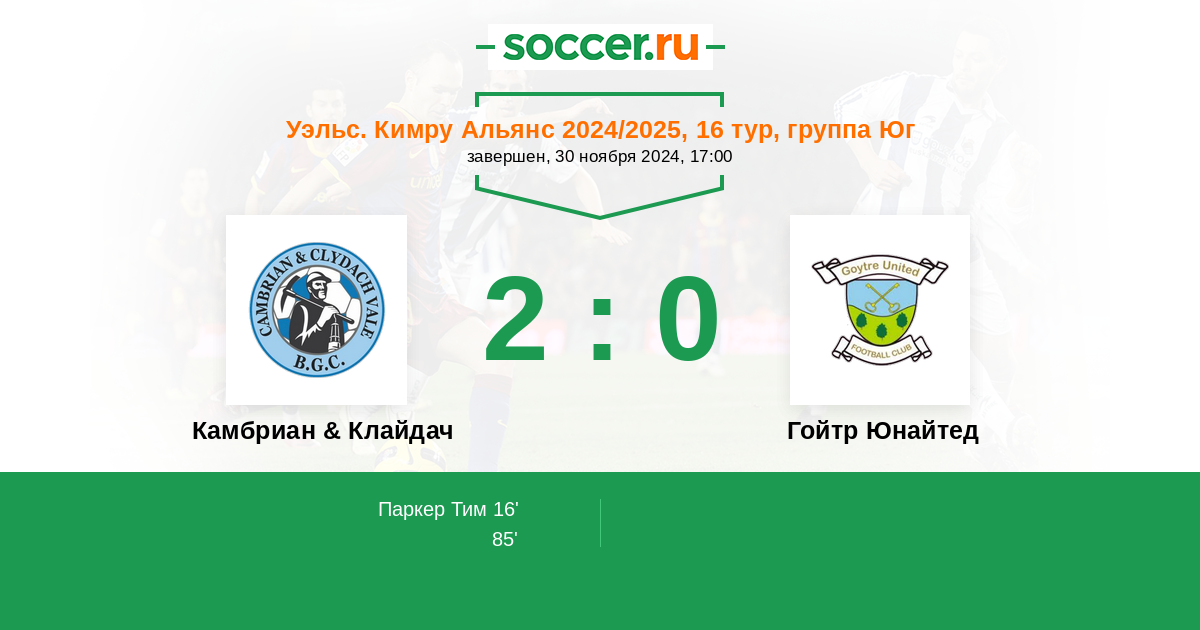 Уэльс. Кимру Альянс 30.09.2023 Гойтр Юнайтед Логотип футбольный клуб Гойтр Юнайтед (Порт-Толбот) 1:0 Логотип футбольный клуб Камбриан & Клайдач (Клайдач Вейл) Камбриан & Клайдач