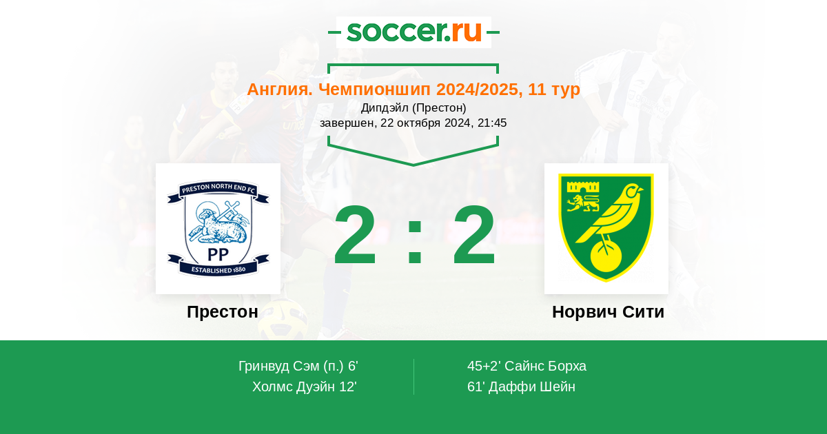 Англия. Чемпионшип 20.12.2025 Престон Логотип футбольный клуб Престон 1:1 Логотип футбольный клуб Норвич Сити Норвич Сити