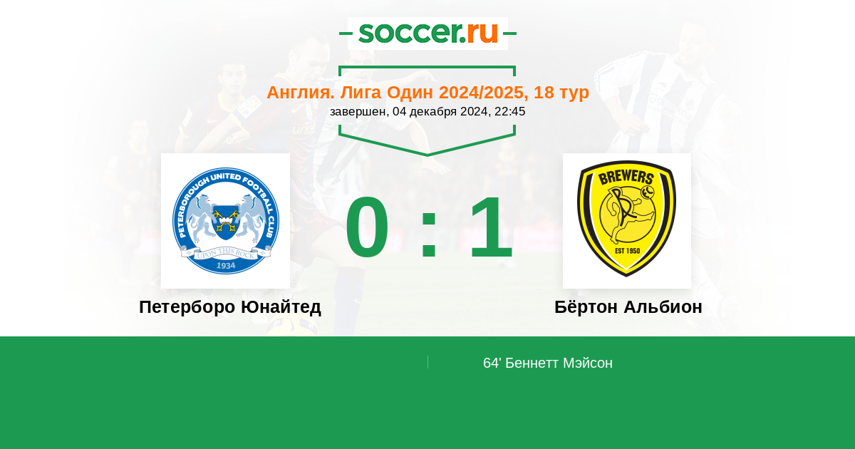 Англия. Первая Футбольная Лига 18.10.2025 Бёртон Альбион Логотип футбольный клуб Бёртон Альбион (Бёртон-апон-Трент) 0:1 Логотип футбольный клуб Петерборо Юнайтед Петерборо Юнайтед