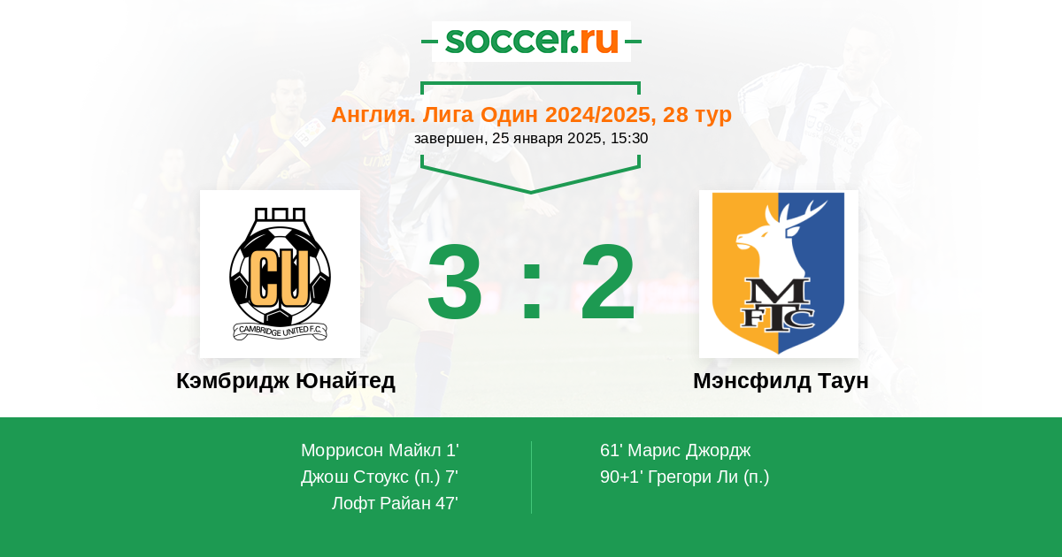 Англия. Первая Футбольная Лига 14.09.2024 Мэнсфилд Таун Логотип футбольный клуб Мэнсфилд Таун 2:1 Логотип футбольный клуб Кэмбридж Юнайтед Кэмбридж Юнайтед