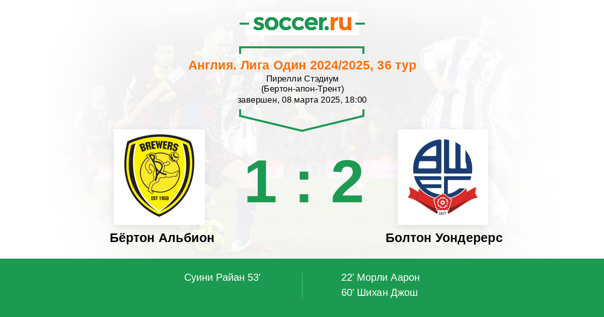 Англия. Первая Футбольная Лига 19.10.2024 Болтон Уондерерс Логотип футбольный клуб Болтон Уондерерс 2:1 Логотип футбольный клуб Бёртон Альбион (Бёртон-апон-Трент) Бёртон Альбион