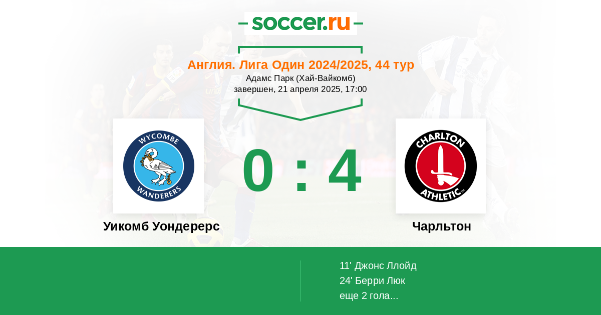 Англия. Первая Футбольная Лига 15.05.2025 Чарльтон Логотип футбольный клуб Чарльтон 1:0 Логотип футбольный клуб Уикомб Уондерерс (Хай-Вайкомб) Уикомб Уондерерс