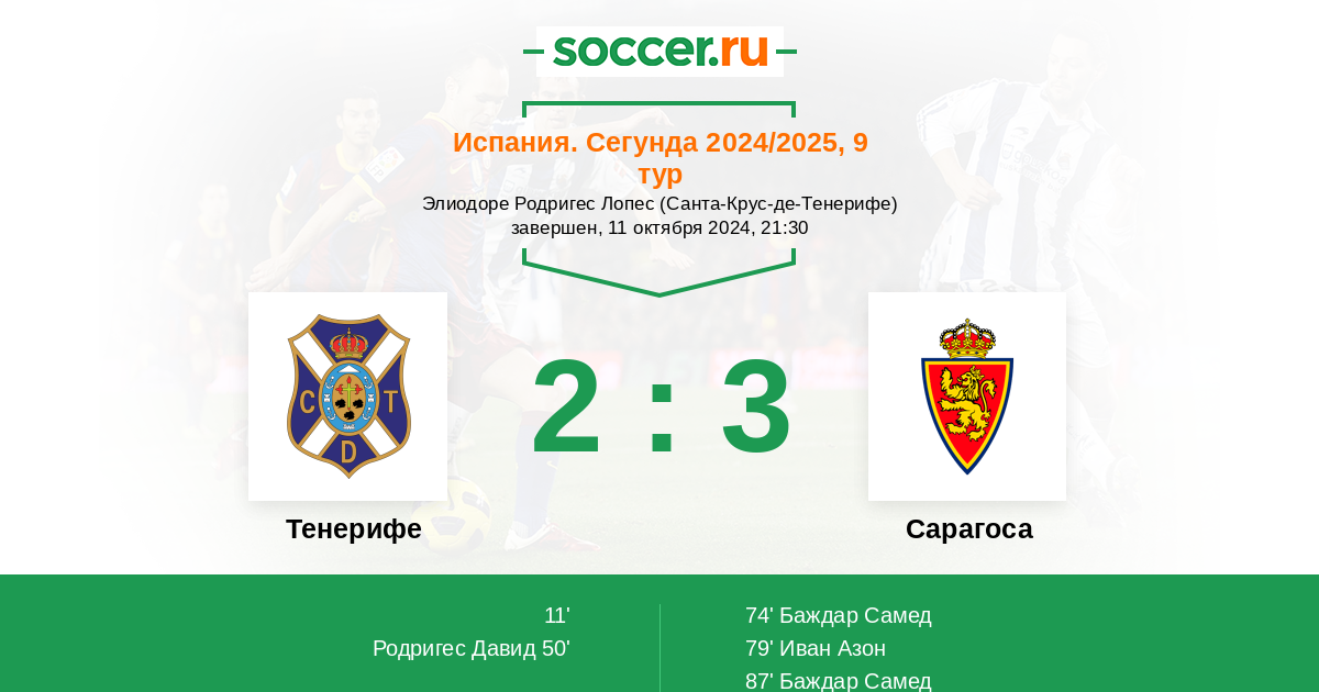 Испания. Сегунда 28.10.2022 Тенерифе Логотип футбольный клуб Тенерифе (Санта-Крус-де-Тенерифе) 0:2 Логотип футбольный клуб Сарагоса Сарагоса