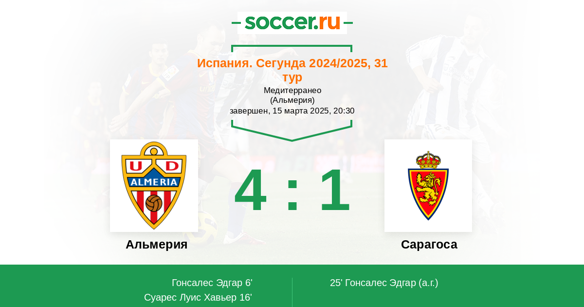 Испания. Сегунда 11.04.2021 Сарагоса Логотип футбольный клуб Сарагоса 2:1 Логотип футбольный клуб Альмерия Альмерия