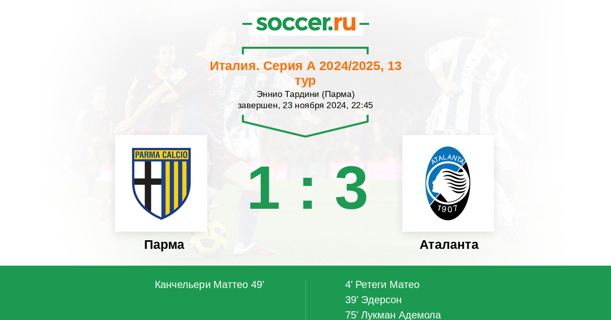 Италия. Серия А 25.01.2026 Аталанта Логотип футбольный клуб Аталанта (Бергамо) 4:0 Логотип футбольный клуб Парма Парма