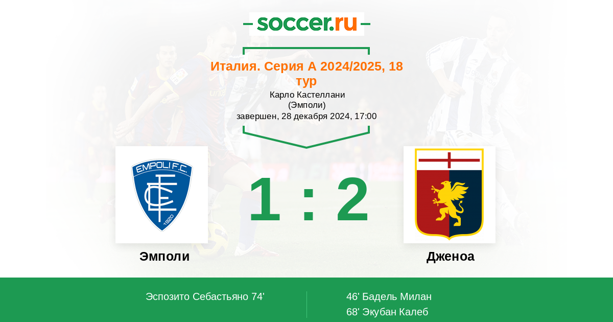 Италия. Серия А 26.08.2018 Дженоа Логотип футбольный клуб Дженоа (Генуя) 2:1 Логотип футбольный клуб Эмполи Эмполи
