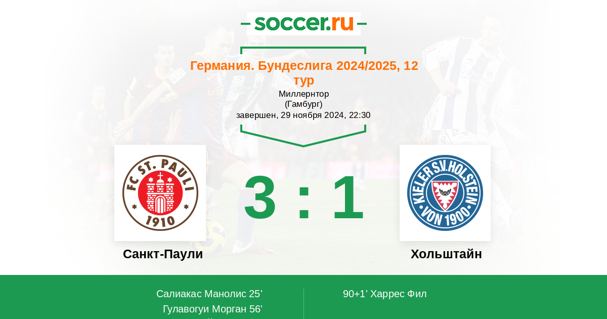 Германия. Бундеслига 12.04.2025 Хольштайн Логотип футбольный клуб Хольштайн (Киль) 1:2 Логотип футбольный клуб Санкт-Паули (Гамбург) Санкт-Паули