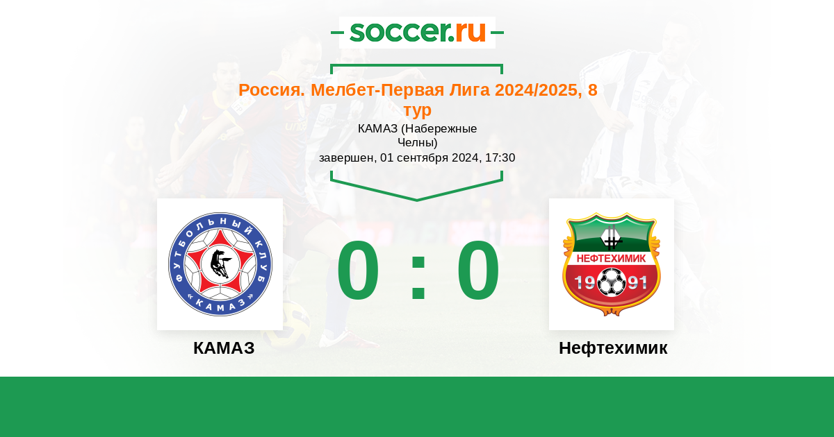 Россия. Первая лига 17.08.2025 Нефтехимик Логотип футбольный клуб Нефтехимик (Нижнекамск) 1:3 Логотип футбольный клуб КАМАЗ (Набережные Челны) КАМАЗ