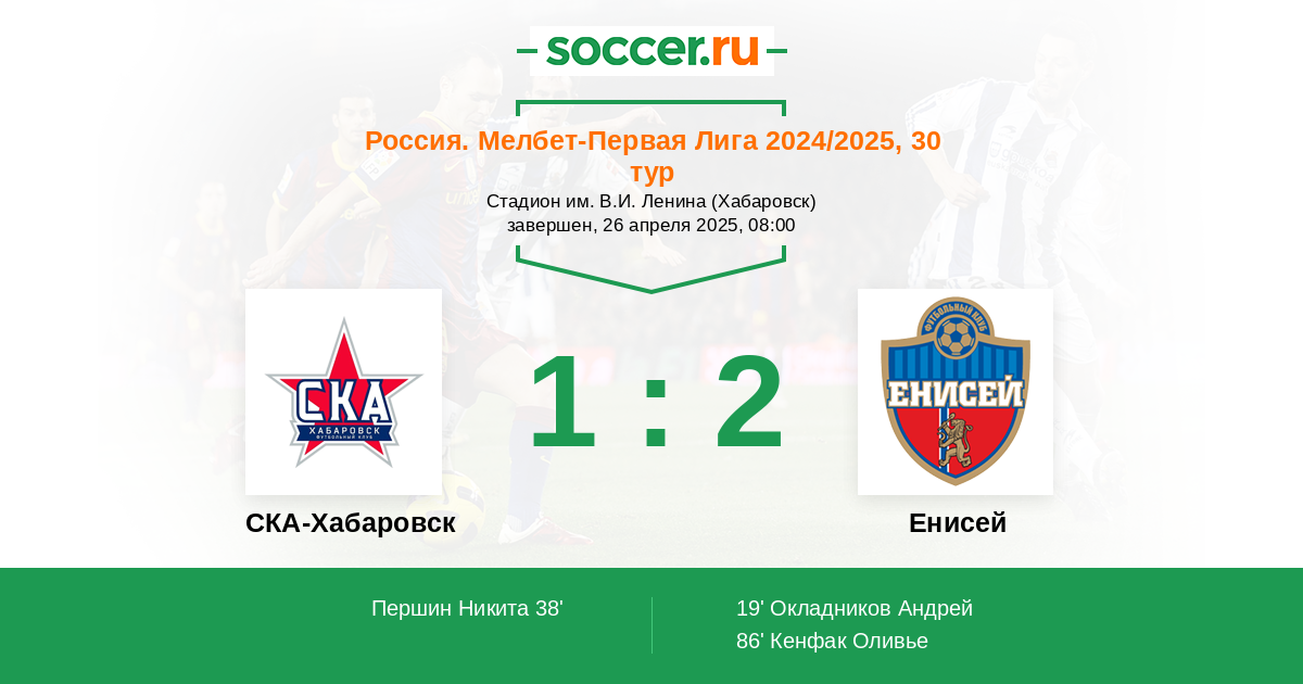Россия. Первая лига 07.04.2021 Енисей Логотип футбольный клуб Енисей (Красноярск) 2:0 Логотип футбольный клуб СКА-Хабаровск СКА-Хабаровск
