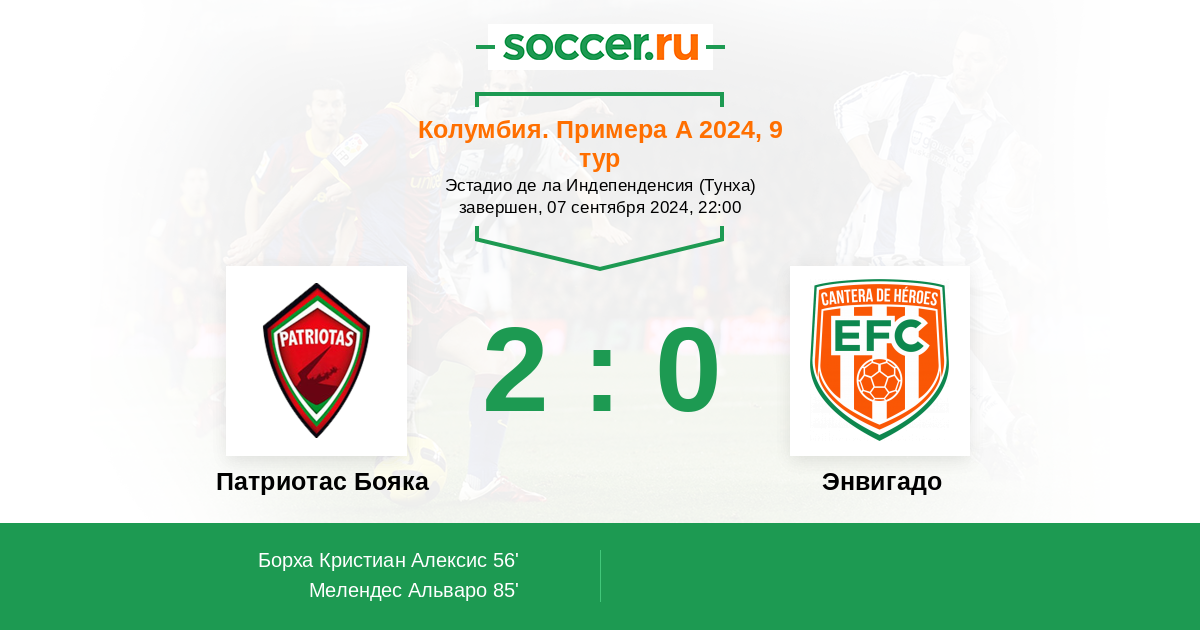 Колумбия. Примера А 09.09.2018 Энвигадо Логотип футбольный клуб Энвигадо 2:1 Логотип футбольный клуб Патриотас Бояка (Тунха) Патриотас Бояка