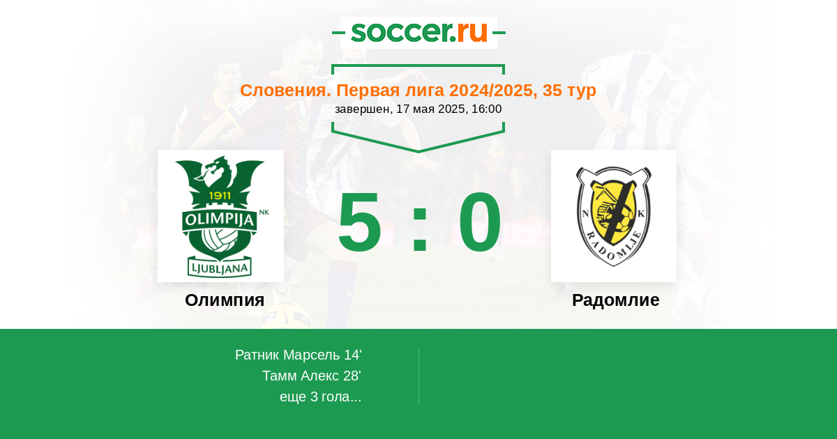 Словения. Первая Лига 03.04.2022 Олимпия Логотип футбольный клуб Олимпия (Любляна) 4:1 Логотип футбольный клуб Радомлие Радомлие