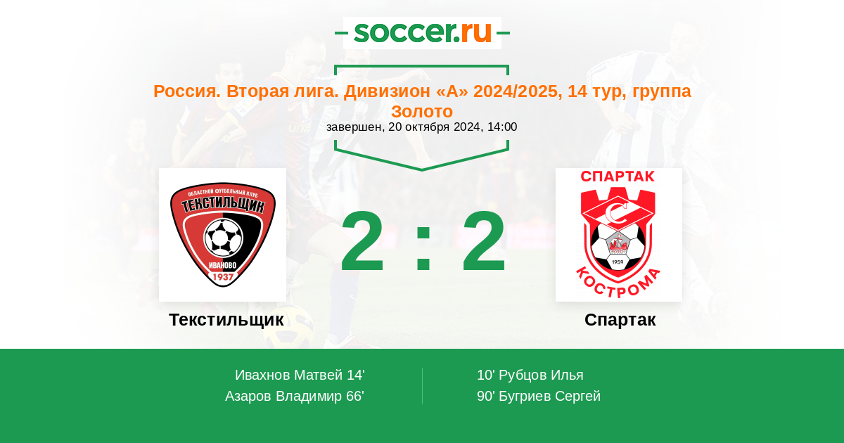 Россия. Вторая лига. Группа 2 24.04.2015 Текстильщик Логотип футбольный клуб Текстильщик (Иваново) 5:0 Логотип футбольный клуб Спартак Кострома Спартак Кострома