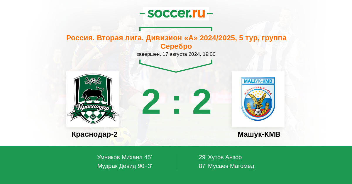 Россия. Вторая лига. Группа 1 02.04.2017 Машук-КМВ Логотип футбольный клуб Машук-КМВ (Пятигорск) 2:1 Логотип футбольный клуб Краснодар-2 Краснодар-2