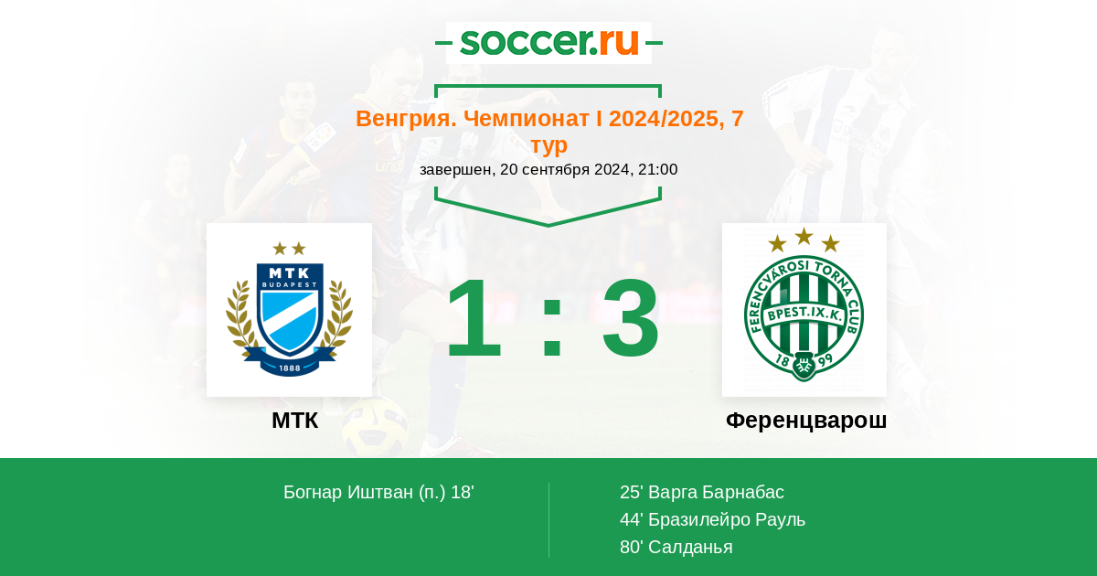 Венгрия. Чемпионат 1 10.09.2016 МТК Логотип футбольный клуб МТК (Будапешт) 2:1 Логотип футбольный клуб Ференцварош (Будапешт) Ференцварош