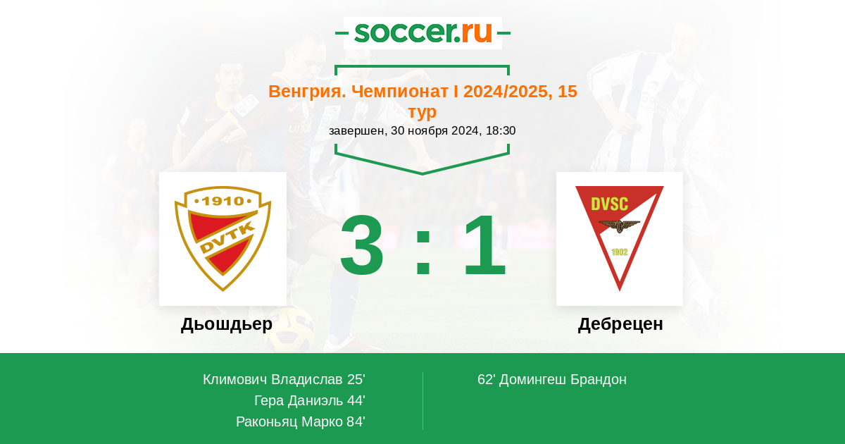 Венгрия. Чемпионат 1 24.09.2016 Дьошдьер Логотип футбольный клуб Дьошдьер (Мишкольц) 1:3 Логотип футбольный клуб Дебрецен Дебрецен