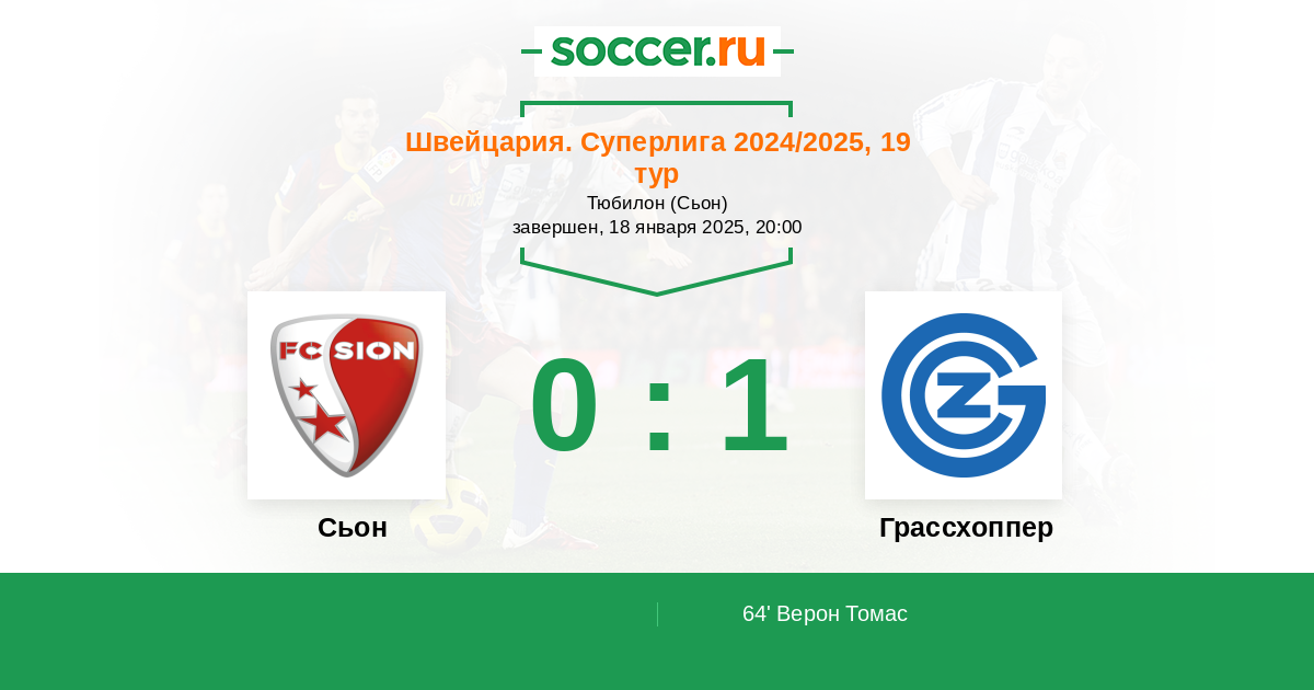 Швейцария. Суперлига 19.10.2025 Грассхоппер Логотип футбольный клуб Грассхоппер (Цюрих) 0:1 Логотип футбольный клуб Сьон Сьон
