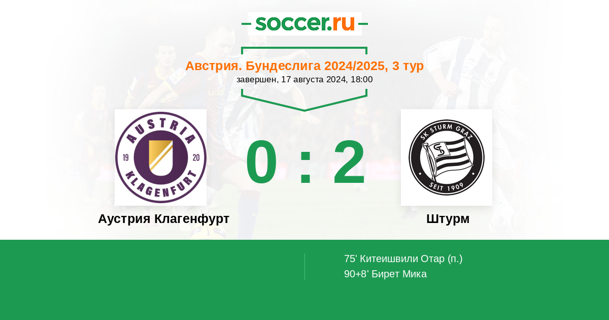 Австрия. Бундеслига 11.09.2022 Аустрия Клагенфурт Логотип футбольный клуб Аустрия Клагенфурт 0:2 Логотип футбольный клуб Штурм (Грац) Штурм