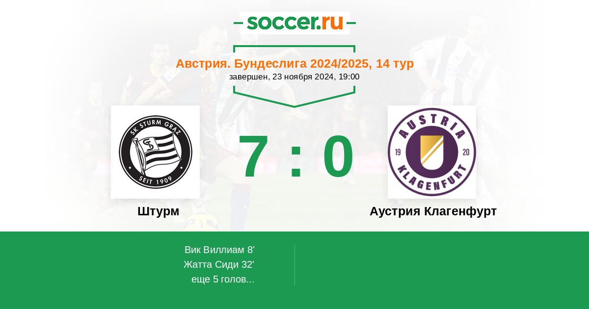 Австрия. Бундеслига 12.11.2023 Аустрия Клагенфурт Логотип футбольный клуб Аустрия Клагенфурт 0:3 Логотип футбольный клуб Штурм (Грац) Штурм