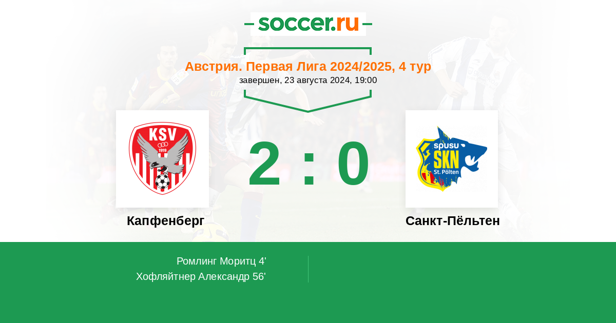 Австрия. Первая Лига 20.08.2023 Капфенберг Логотип футбольный клуб Капфенберг 0:3 Логотип футбольный клуб Санкт-Пёльтен (Санкт-Пельтен) Санкт-Пёльтен