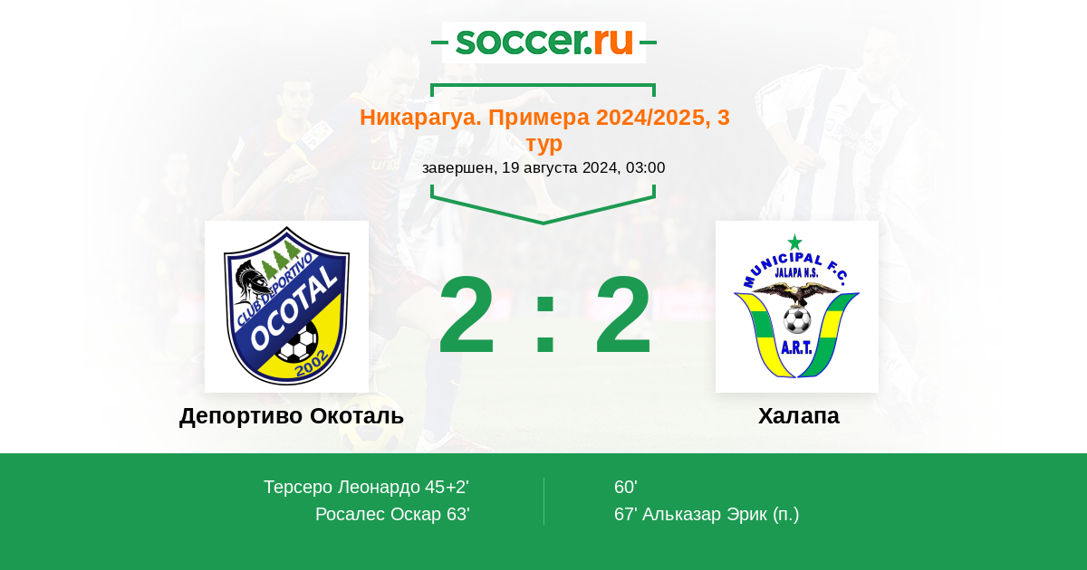 Никарагуа. Примера 04.03.2024 Халапа Логотип футбольный клуб Халапа (Окоталь) 2:2 Логотип футбольный клуб Депортиво Окоталь Депортиво Окоталь