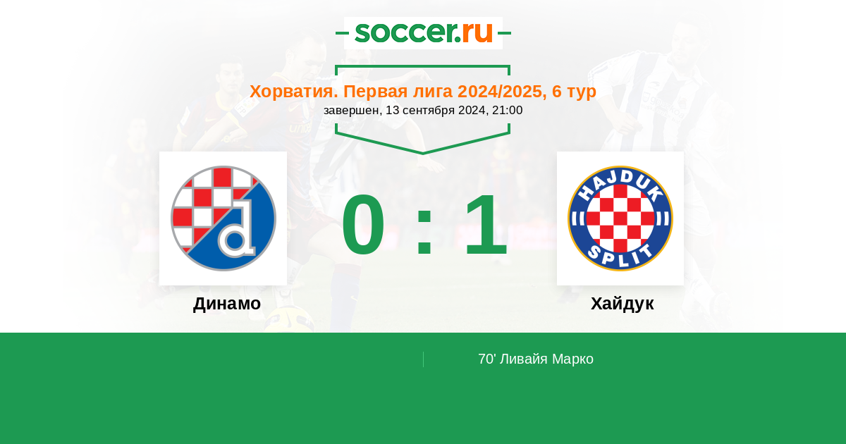 Хорватия. Первая лига 01.10.2023 Хайдук Логотип футбольный клуб Хайдук (Сплит) 1:0 Логотип футбольный клуб Динамо (Загреб) Динамо