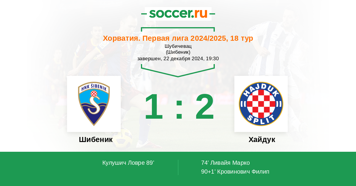 Хорватия. Первая лига 09.04.2022 Хайдук Логотип футбольный клуб Хайдук (Сплит) 2:1 Логотип футбольный клуб Шибеник Шибеник