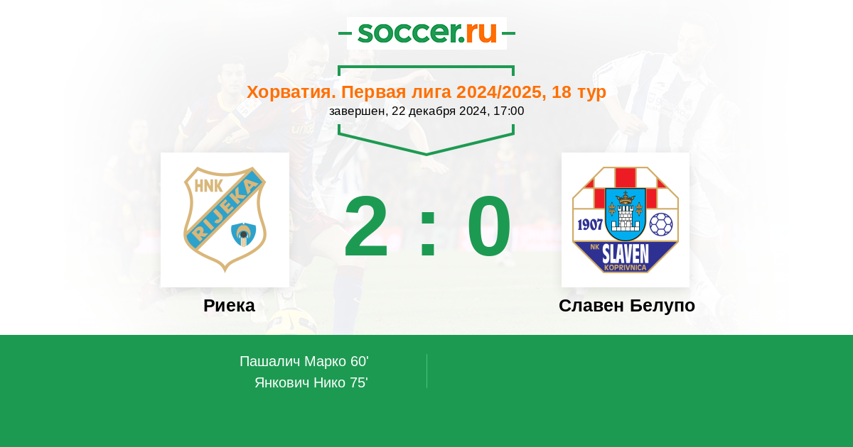 Хорватия. Первая лига 25.02.2023 Риека Логотип футбольный клуб Риека 0:1 Логотип футбольный клуб Славен Белупо (Копривница) Славен Белупо