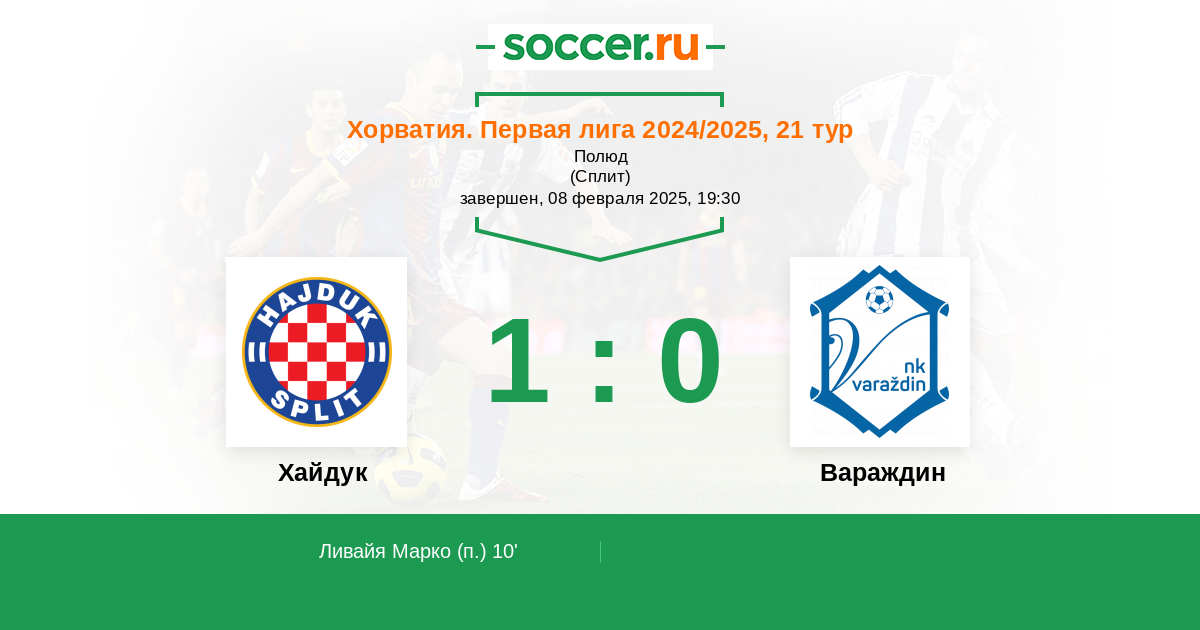 Хорватия. Первая лига 06.03.2021 Хайдук Логотип футбольный клуб Хайдук (Сплит) 2:0 Логотип футбольный клуб Вараждин Вараждин