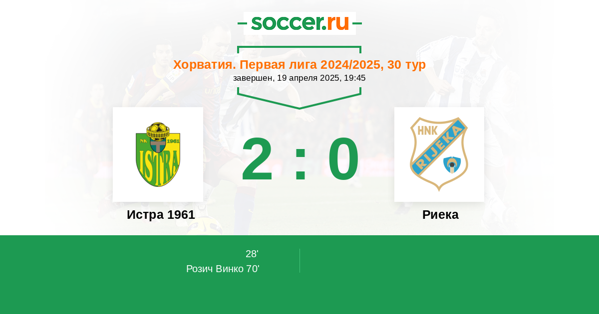 Хорватия. Первая лига 14.04.2024 Истра 1961 Логотип футбольный клуб Истра 1961 (Пула) 0:2 Логотип футбольный клуб Риека Риека