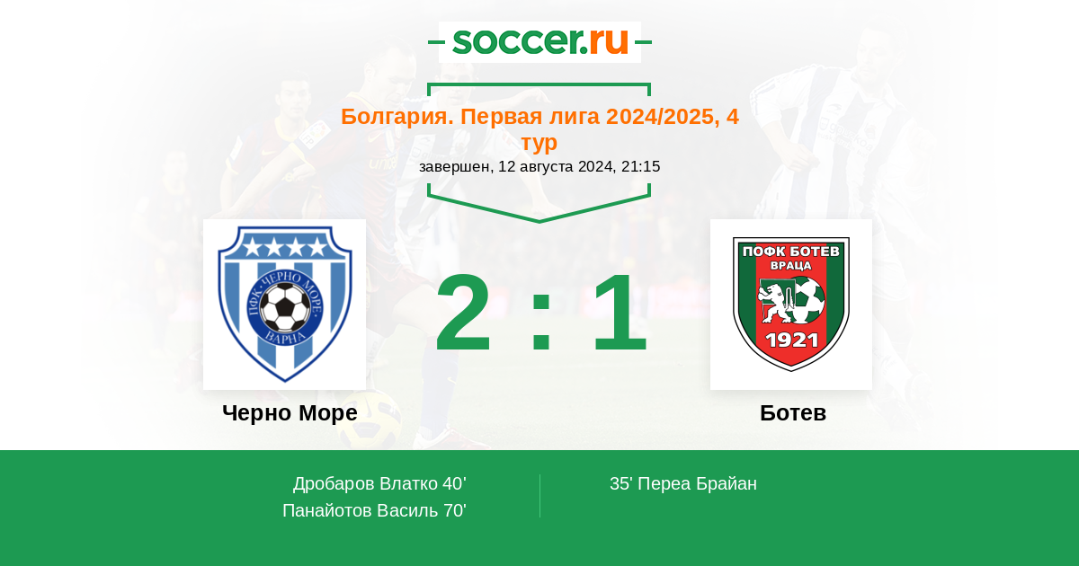 Болгария. Первая лига 29.08.2025 Ботев Логотип футбольный клуб Ботев (Враца) 1:0 Логотип футбольный клуб Черно Море (Варна) Черно Море