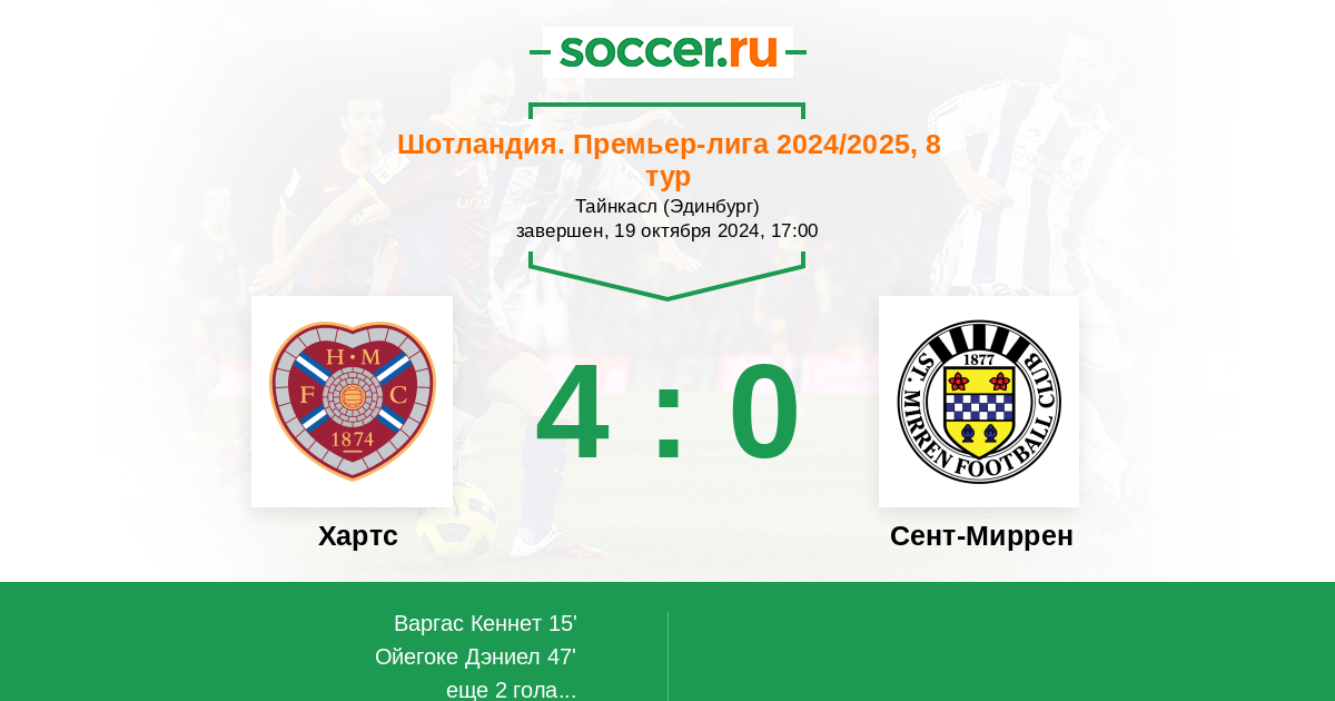 Шотландия. Премьер-Лига 21.09.2024 Сент-Миррен Логотип футбольный клуб Сент-Миррен (Пейсли) 2:1 Логотип футбольный клуб Хартс (Эдинбург) Хартс