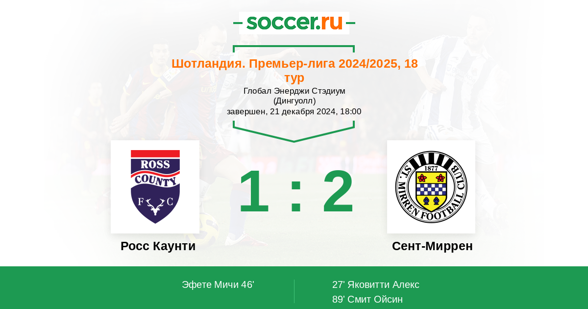 Шотландия. Премьер-Лига 26.12.2020 Росс Каунти Логотип футбольный клуб Росс Каунти (Дингволл) 0:2 Логотип футбольный клуб Сент-Миррен (Пейсли) Сент-Миррен