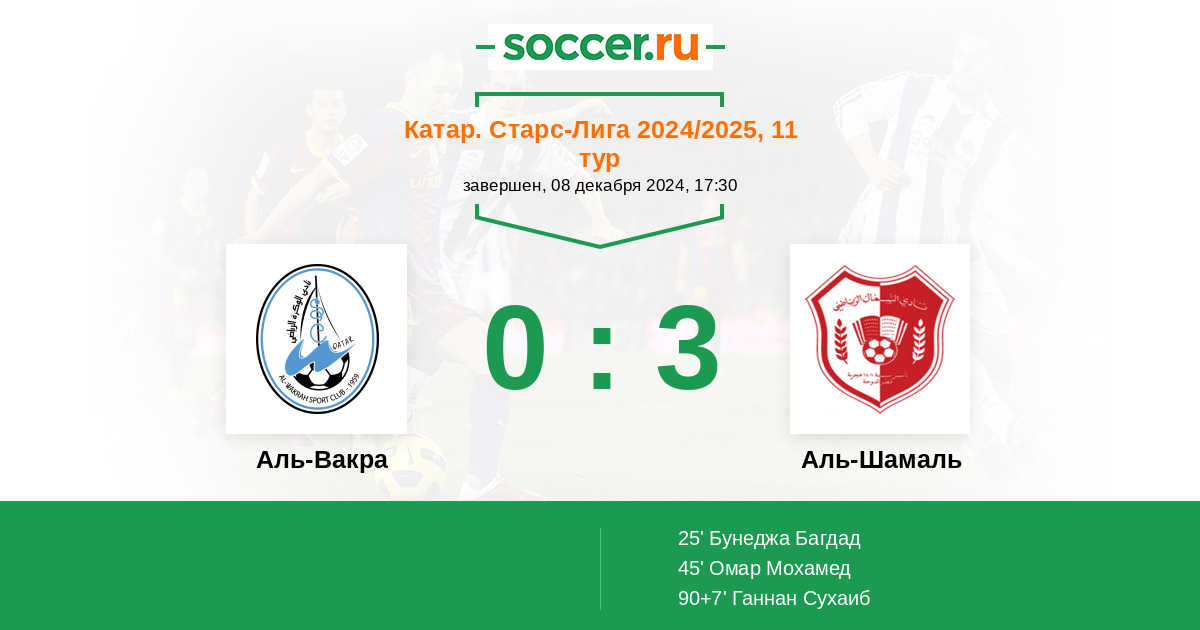 Катар. Старс Лига 18.04.2025 Аль-Шамаль Логотип футбольный клуб Аль-Шамаль (Аш-Шамаль) 1:0 Логотип футбольный клуб Аль-Вакра Аль-Вакра