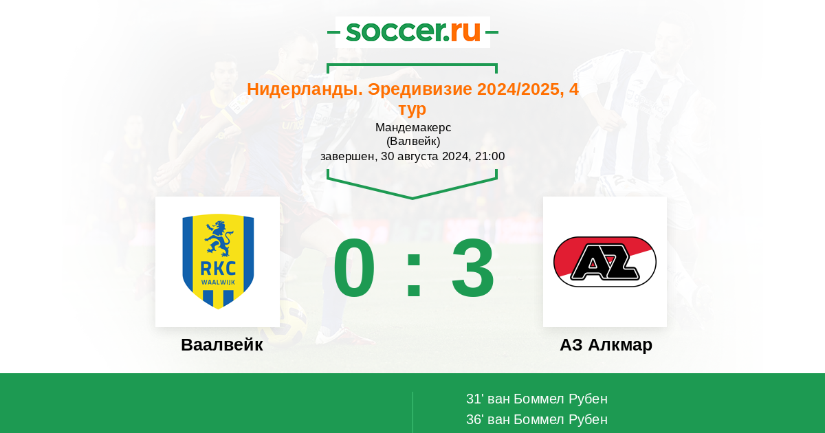 Нидерланды. Эредивизи 14.08.2021 Ваалвейк Логотип футбольный клуб Ваалвейк (Валвейк) 1:0 Логотип футбольный клуб АЗ Алкмар АЗ Алкмар