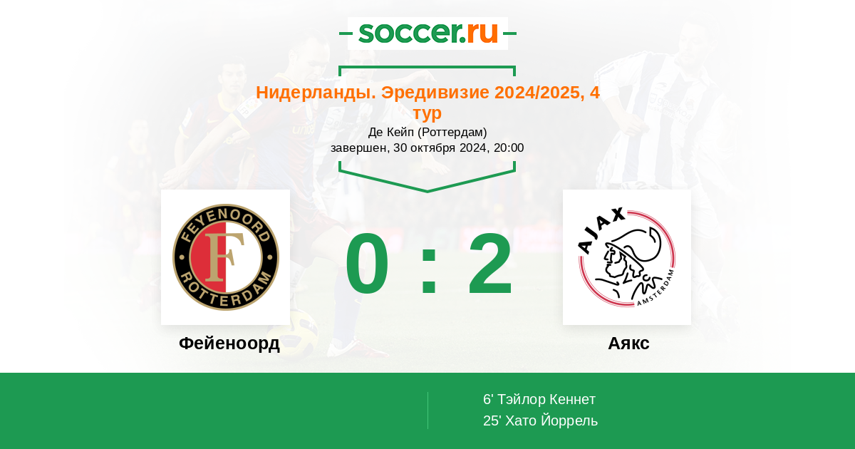 Нидерланды. Эредивизи 02.02.2025 Аякс Логотип футбольный клуб Аякс (Амстердам) 2:1 Логотип футбольный клуб Фейеноорд (Роттердам) Фейеноорд