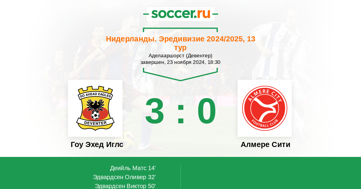 Нидерланды. Первый дивизион 22.12.2012 Гоу Эхед Иглс Логотип футбольный клуб Гоу Эхед Иглс (Девентер) 2:2 Логотип футбольный клуб Алмере Сити Алмере Сити