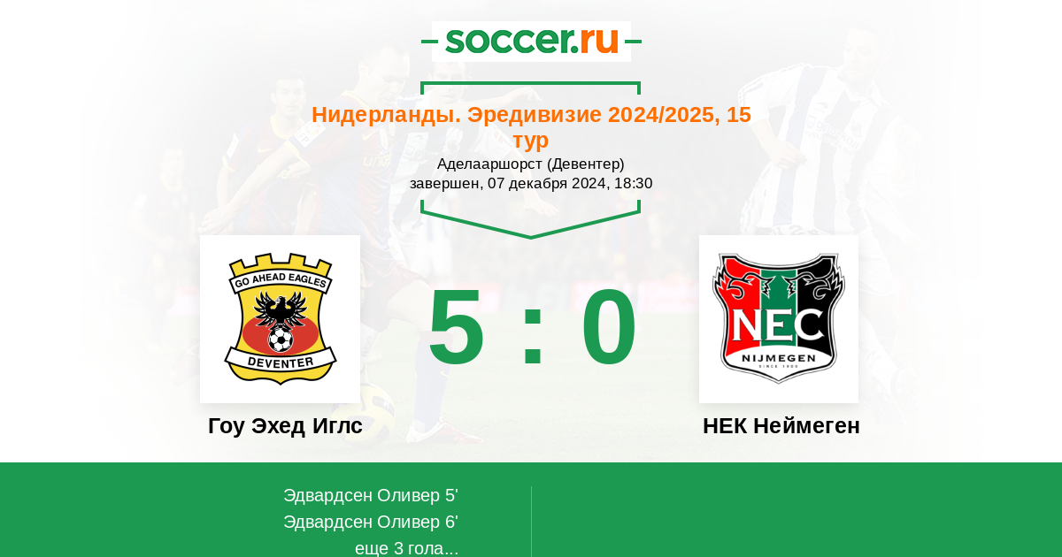 Нидерланды. Эредивизи 19.12.2021 Гоу Эхед Иглс Логотип футбольный клуб Гоу Эхед Иглс (Девентер) 0:2 Логотип футбольный клуб НЕК Неймеген НЕК Неймеген