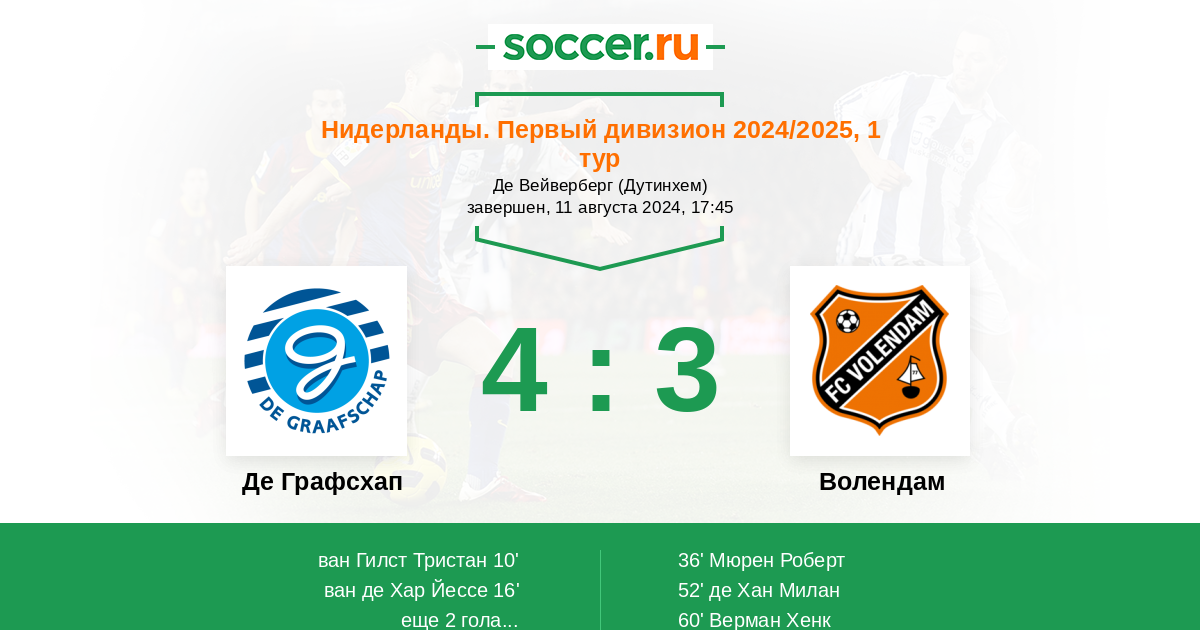 Нидерланды. Первый дивизион 23.08.2019 Де Графсхап Логотип футбольный клуб Де Графсхап (Дутинхем) 3:0 Логотип футбольный клуб Волендам Волендам