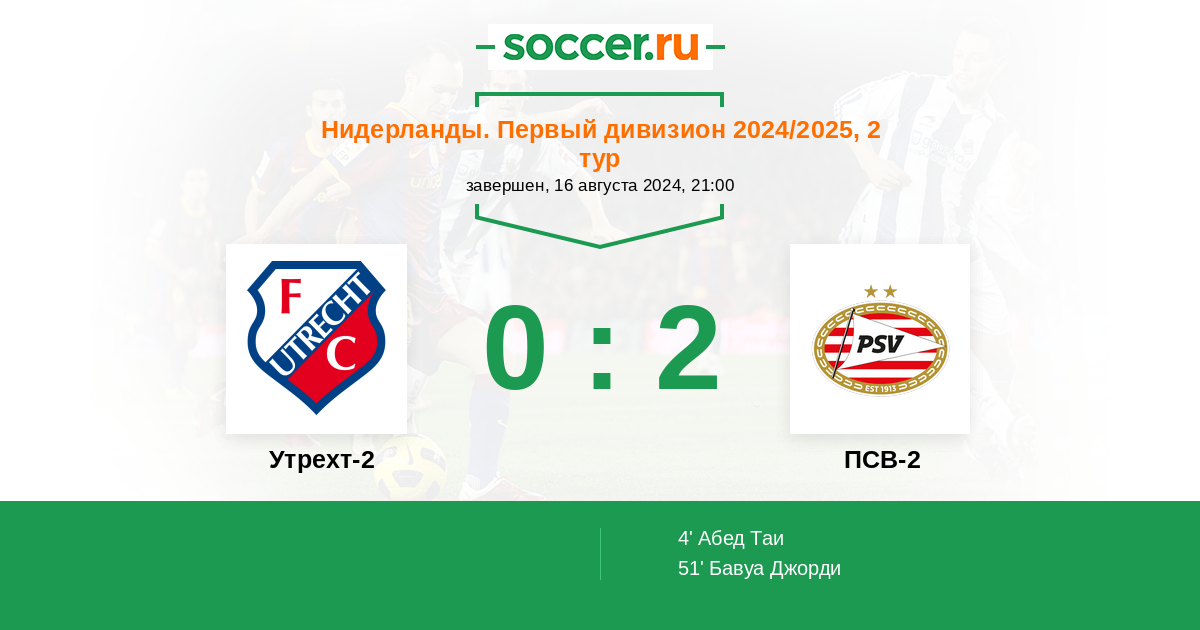 Нидерланды. Первый дивизион 26.08.2016 ПСВ-2 Логотип футбольный клуб ПСВ-2 (Эйндховен) 2:0 Логотип футбольный клуб Утрехт-2 Утрехт-2