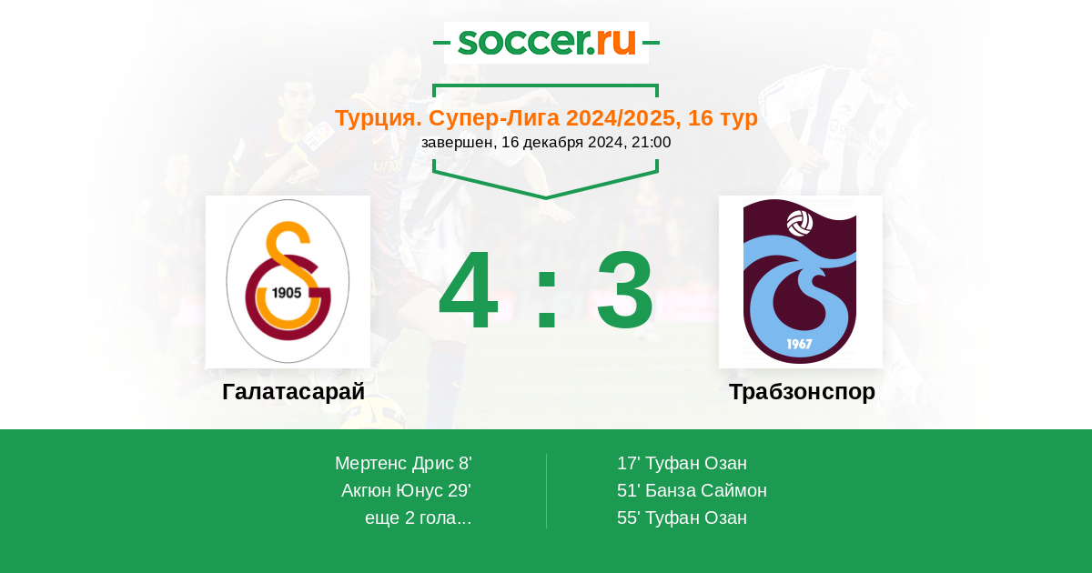 Турция. Суперлига 10.02.2019 Галатасарай Логотип футбольный клуб Галатасарай (Стамбул) 3:1 Логотип футбольный клуб Трабзонспор Трабзонспор
