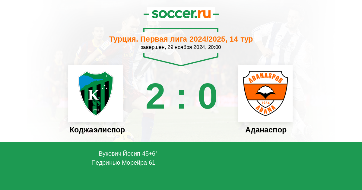 Турция. Первая лига 03.02.2024 Коджаэлиспор Логотип футбольный клуб Коджаэлиспор 1:0 Логотип футбольный клуб Аданаспор Аданаспор