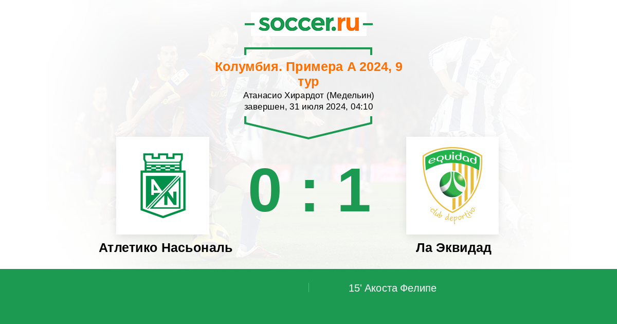 Колумбия. Примера А 02.09.2014 Ла Эквидад Логотип футбольный клуб Ла Эквидад (Богота) 0:4 Логотип футбольный клуб Атлетико Насьональ (Медельин) Атлетико Насьональ