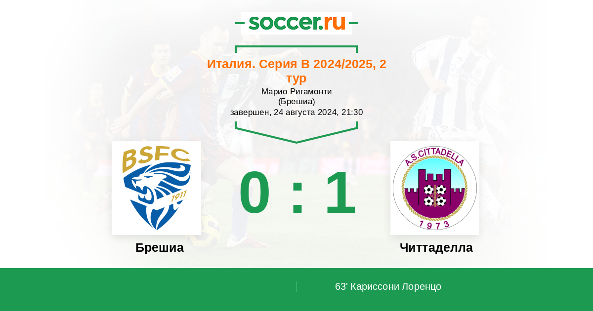Италия. Серия В 24.09.2016 Читтаделла Логотип футбольный клуб Читтаделла 0:3 Логотип футбольный клуб Брешиа Брешиа