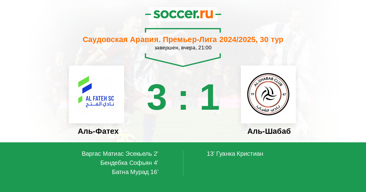 Саудовская Аравия. Премьер-Лига 04.03.2017 Аль-Фатех Логотип футбольный клуб Аль-Фатех (Эль-Хаса) 1:1 Логотип футбольный клуб Аль-Шабаб (Эр-Рияд) Аль-Шабаб
