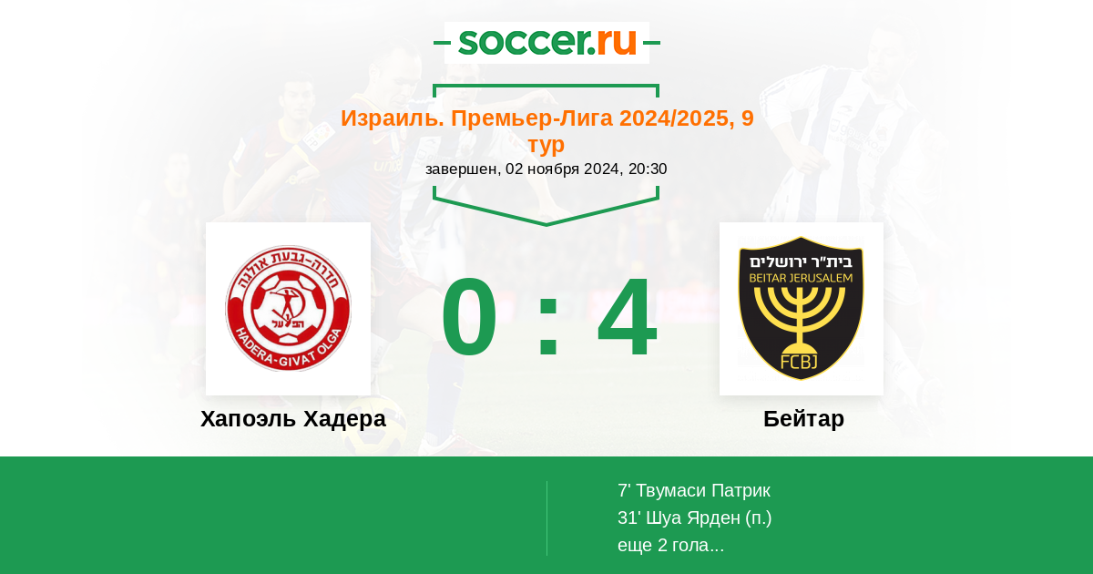 Израиль. Премьер-Лига 04.11.2020 Бейтар Логотип футбольный клуб Бейтар (Иерусалим) 4:0 Логотип футбольный клуб Хапоэль Хадера Хапоэль Хадера