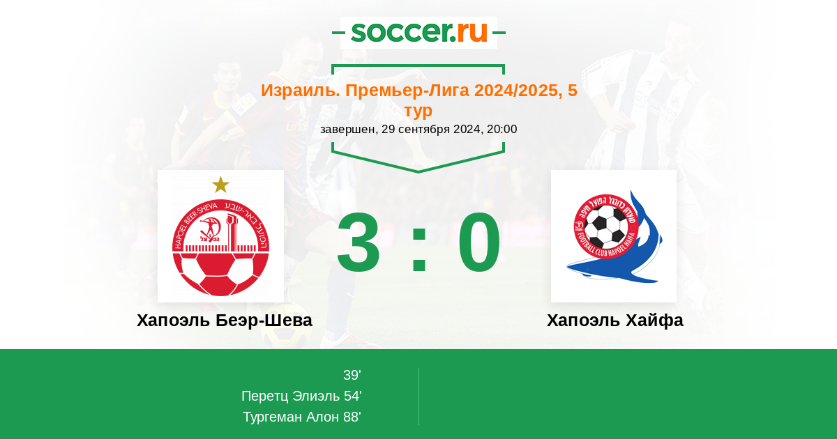 Израиль. Премьер-Лига 05.10.2019 Хапоэль Хайфа Логотип футбольный клуб Хапоэль Хайфа 0:3 Логотип футбольный клуб Хапоэль Беэр-Шева Хапоэль Беэр-Шева