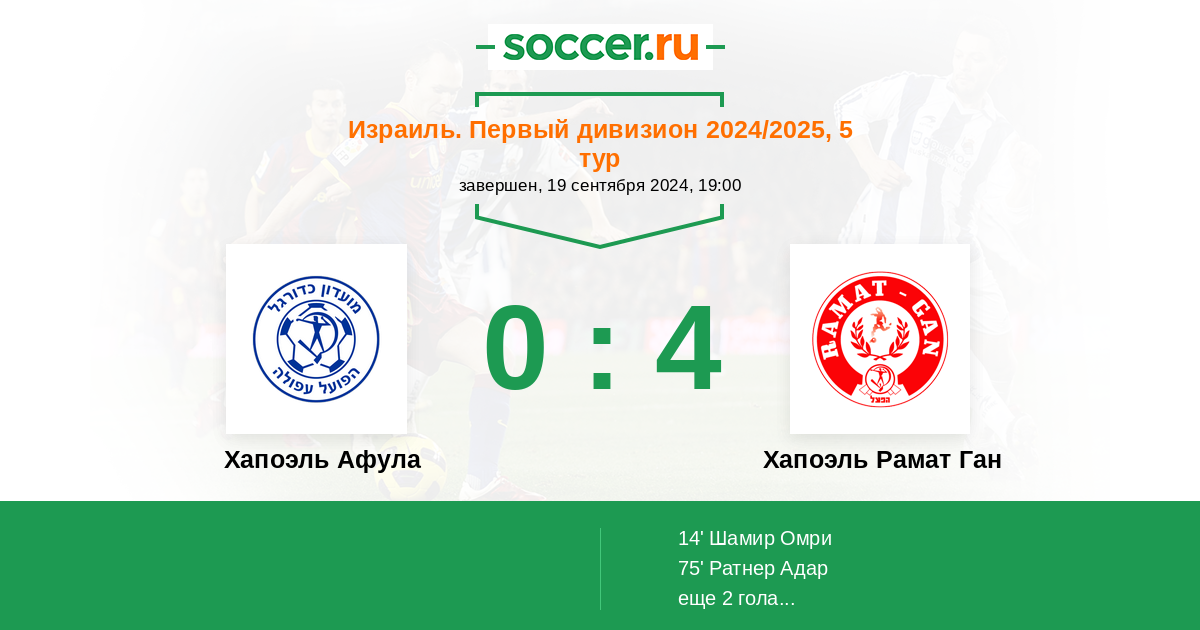 Израиль. Первый дивизион 21.09.2025 Хапоэль Рамат Ган Логотип футбольный клуб Хапоэль Рамат Ган 4:1 Логотип футбольный клуб Хапоэль Афула Хапоэль Афула