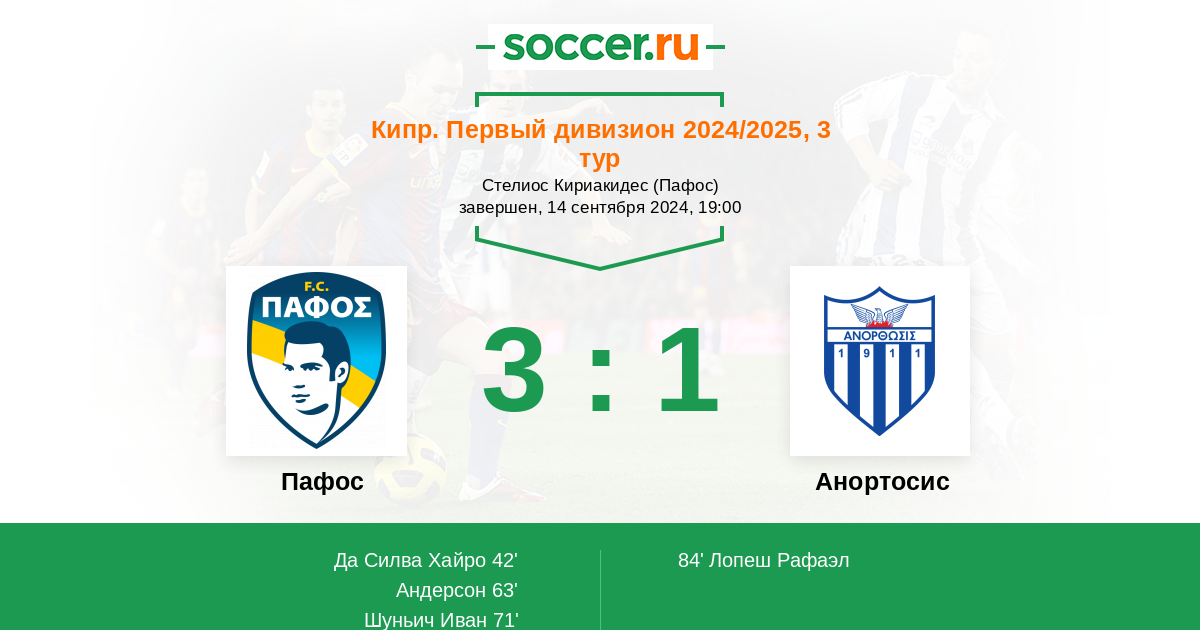 Кипр. Первый Дивизион 22.09.2019 Анортосис Логотип футбольный клуб Анортосис (Ларнака) 2:0 Логотип футбольный клуб Пафос Пафос