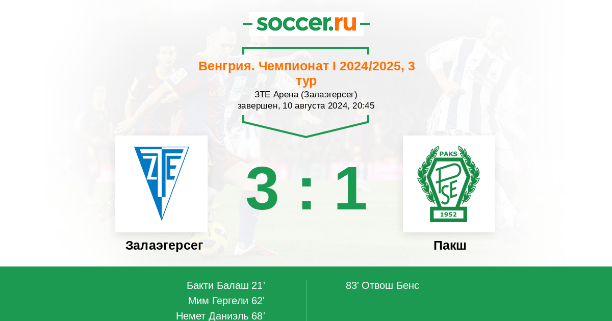 Венгрия. Чемпионат 1 18.10.2020 Пакш Логотип футбольный клуб Пакш 3:1 Логотип футбольный клуб Залаэгерсег Залаэгерсег